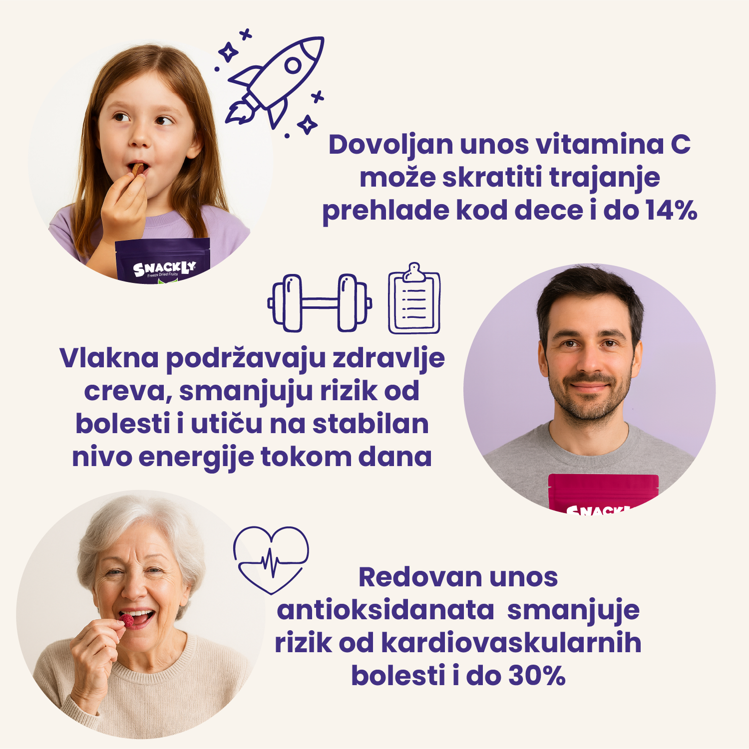 ✔ 120 g (6 kesica) Snackly voća = približno 1,1 kg svežeg voća